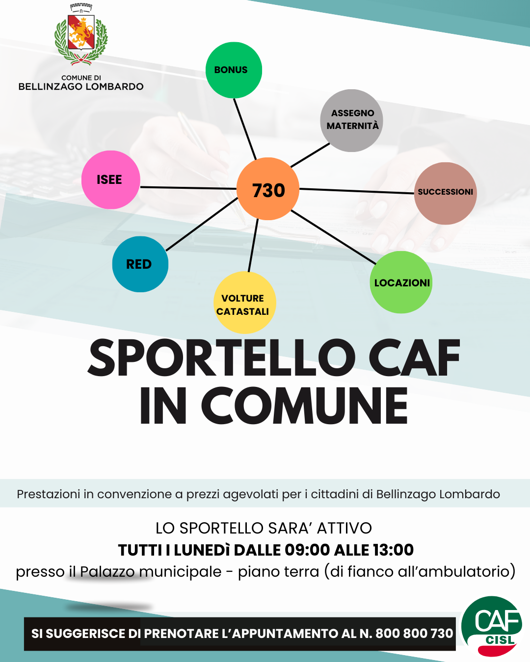 Presso il Comune di Bellinzago Lombardo è attivo uno sportello CAF convenzionato e gestito da CAF – CISL