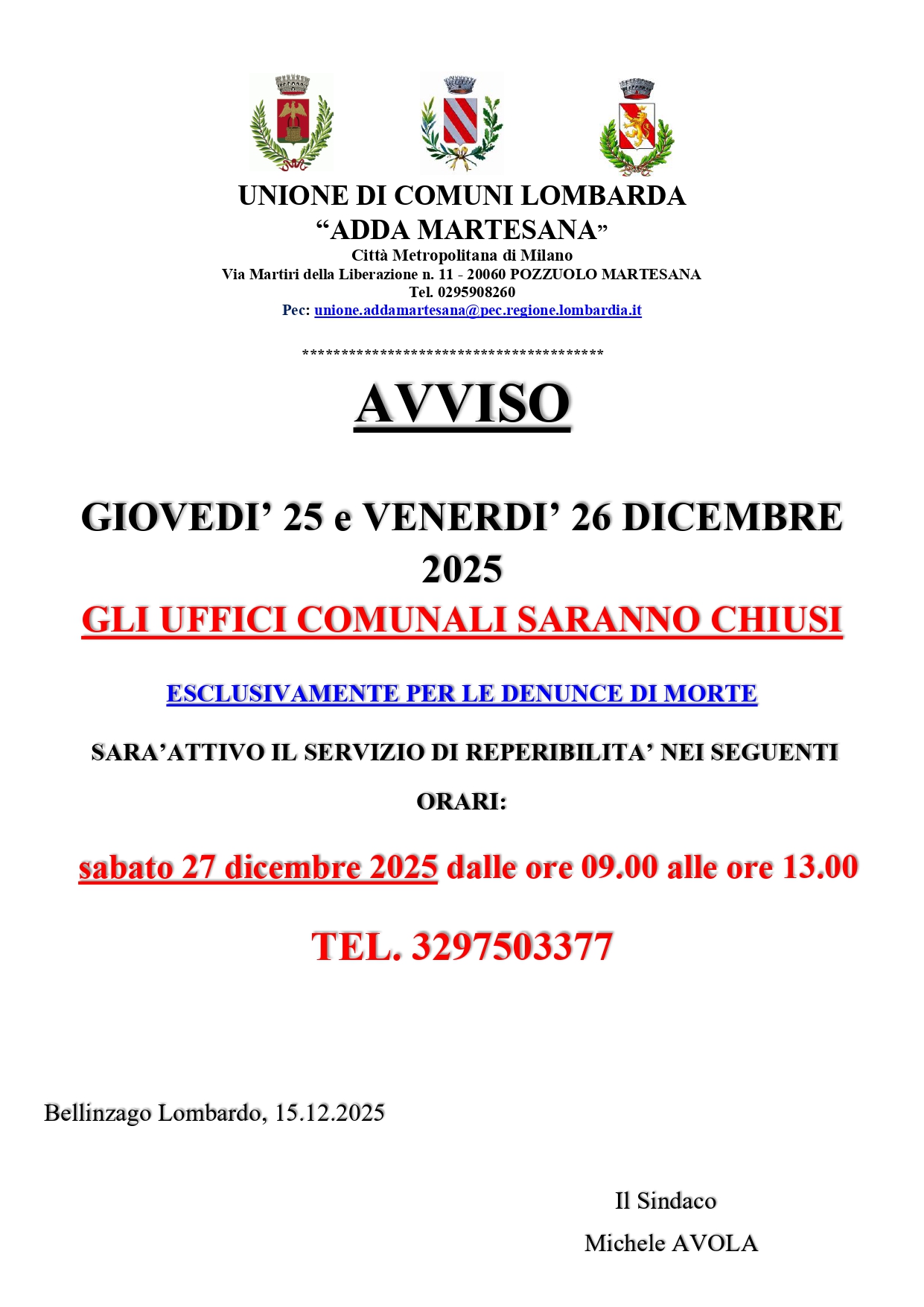 UFFICI COMUNALI – MODIFICA ORARI APERTURA AL PUBBLICO NELLA GIORNATA DEL 30.12.2025 E CHIUSURA UFFICI IL 02.01.2026 e 05.01.2026