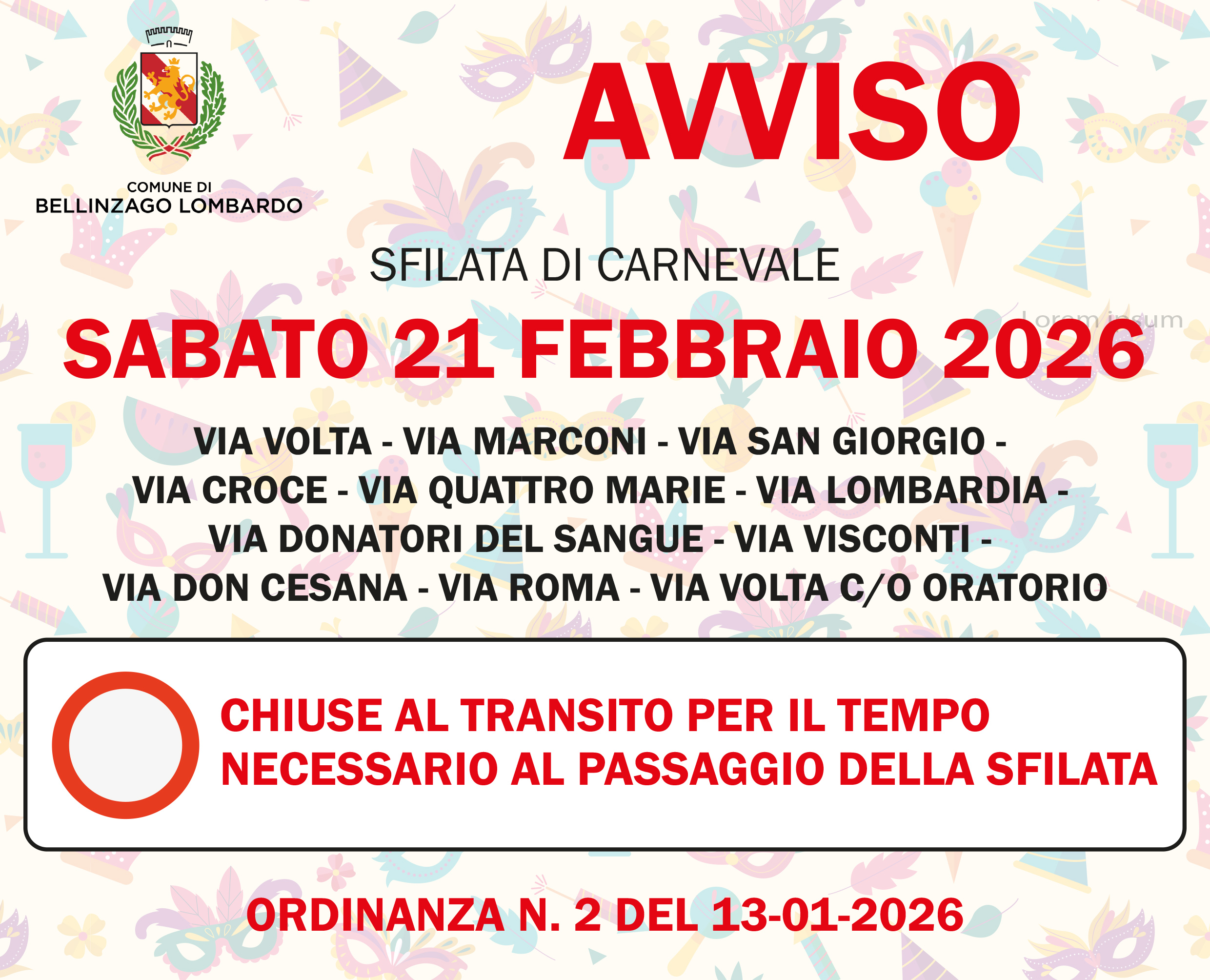 MODIFICA TEMPORANEA DELLA VIABILITA’ CON ISTITUZIONE DEL DIVIETO DI TRANSITO PER SFILATA DI CARNEVALE PER IL GIORNO 21 FEBBRAIO 2026