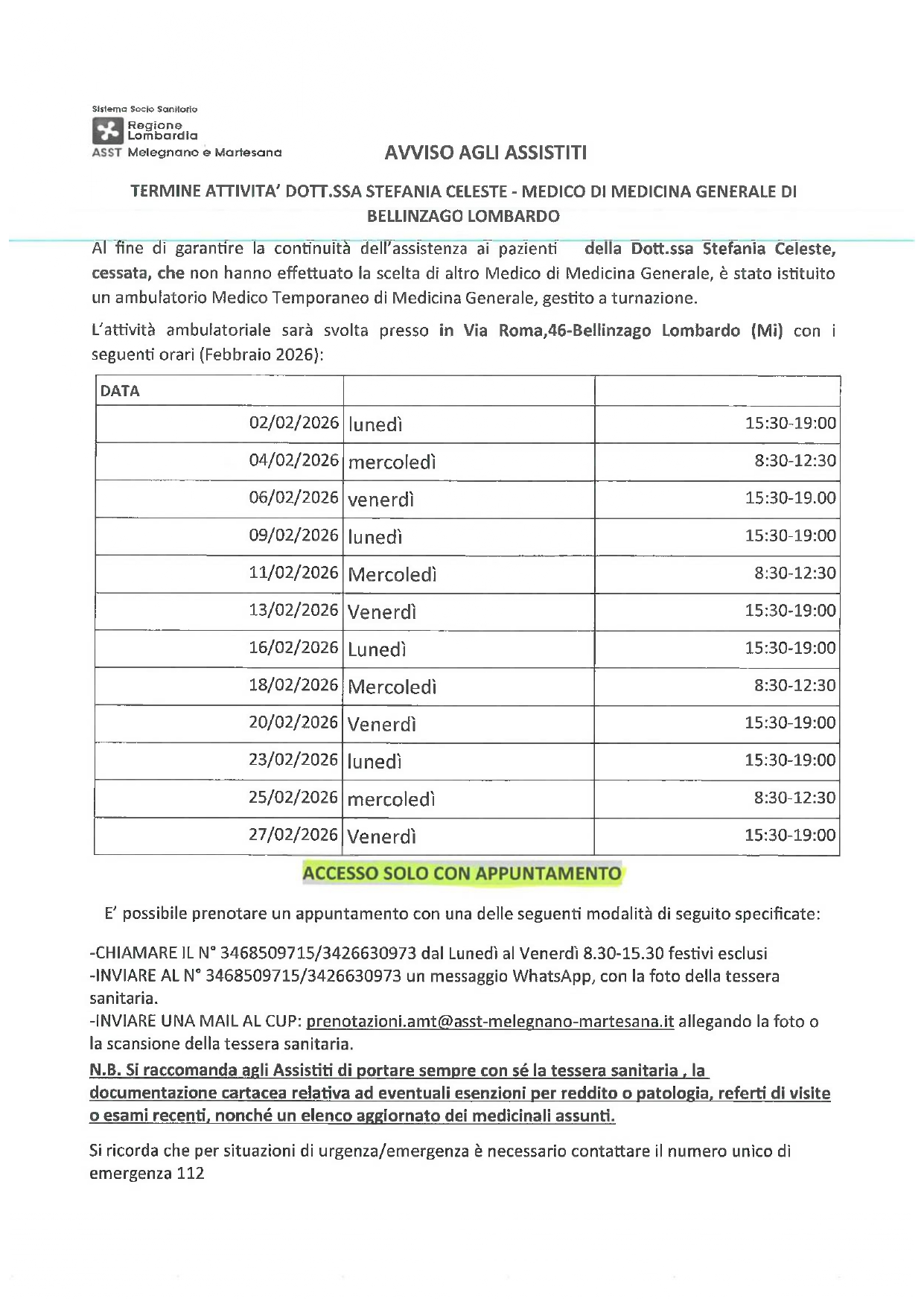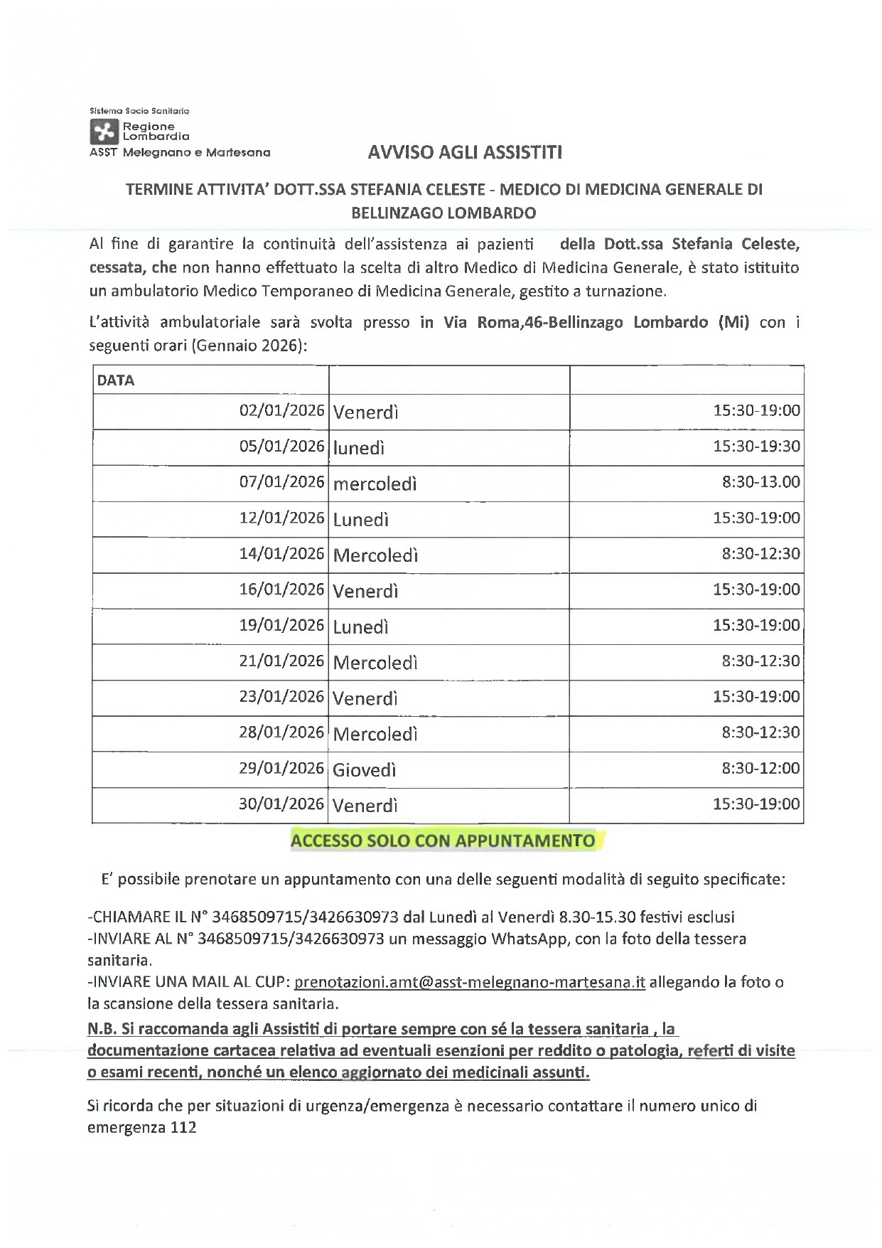 ORARI AMBULATORIO MEDICO TEMPORANEO MESE DI GENNAIO E FEBBRAIO 2026