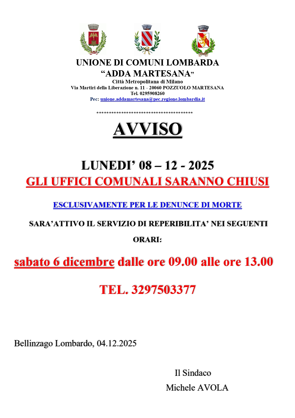 IL SINDACO ORDINA l’apertura al pubblico degli uffici comunali il giorno martedì 30.12.2025 dalle ore 09:00 alle ore 12:30; la chiusura degli uffici comunali nell’intera gio [...]