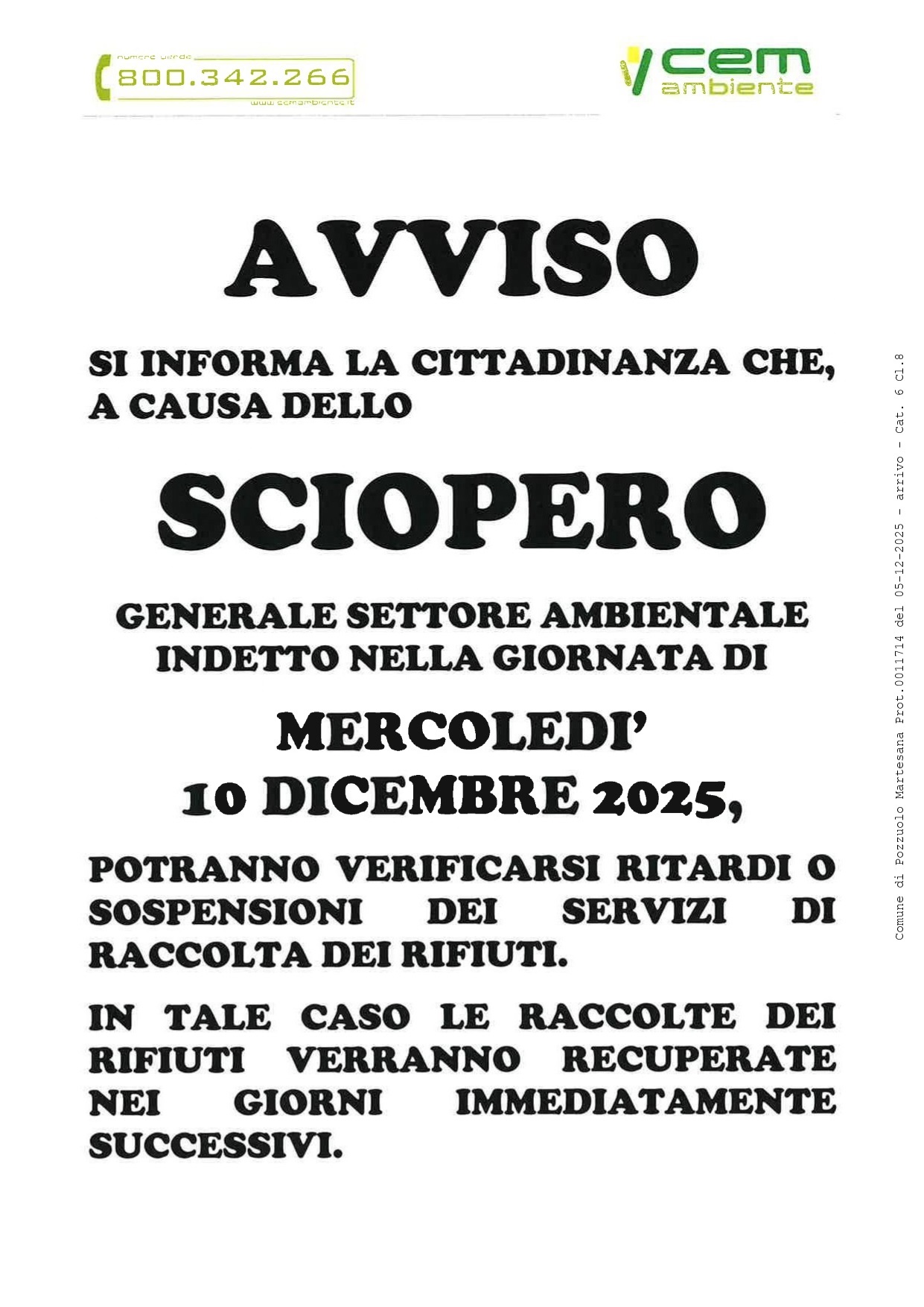 POSSIBILI DISAGI IL 10 DICEMBRE 2025 PER SCIOPERO GENERALE COMPARTO AMBIENTALE