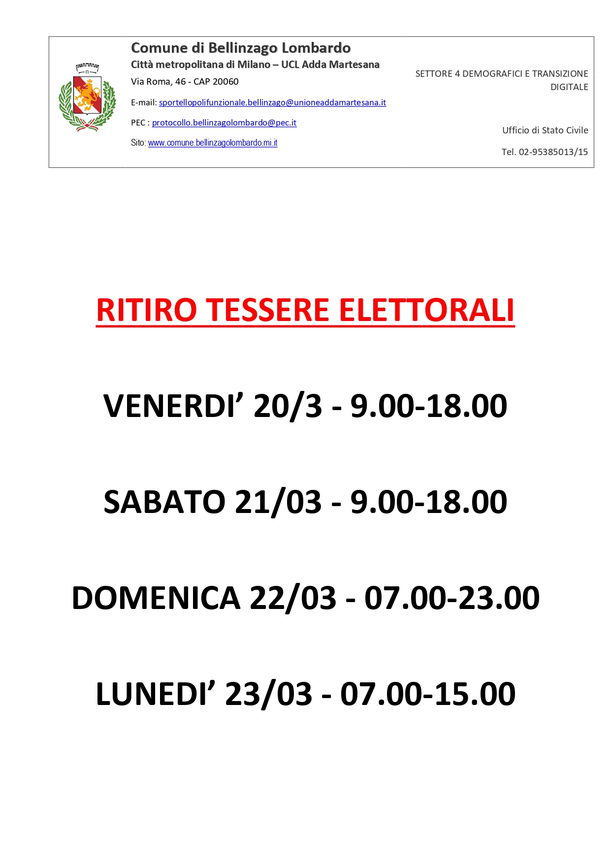 RITIRO SCHEDE ELETTORALI 12 Marzo 2026 Si informano i cittadini che per il ritiro delle tessere elettorali il Comune avrà le seguenti aperture straordinarie Condividi sui Social! Facebook Twitter LinkedIn